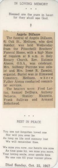 The funeral of Angelo DiZazzo, 61 Oak St., Methuen, who died Sunday, was held Wednesday from the Pitocchelli Brothers Funeral Home, with a high Mass of requiem at 9 a.m. in Holy Rosary Church. Rev. Eutimio Alonso, O.S.A. was celebrant. Mrs. Antholy Perrone was soloist and Mrs. Irene R. Zannini, organist. Burial was in Elmwood Cemetery, Methuen, where Father Alonso conducted committal services. The bearers were: Fred Lattini, Samuel DelDuca, Anthony DeLucia, Stanley Mazzota, Frank Sulluivan and Armand Robichaud. |
