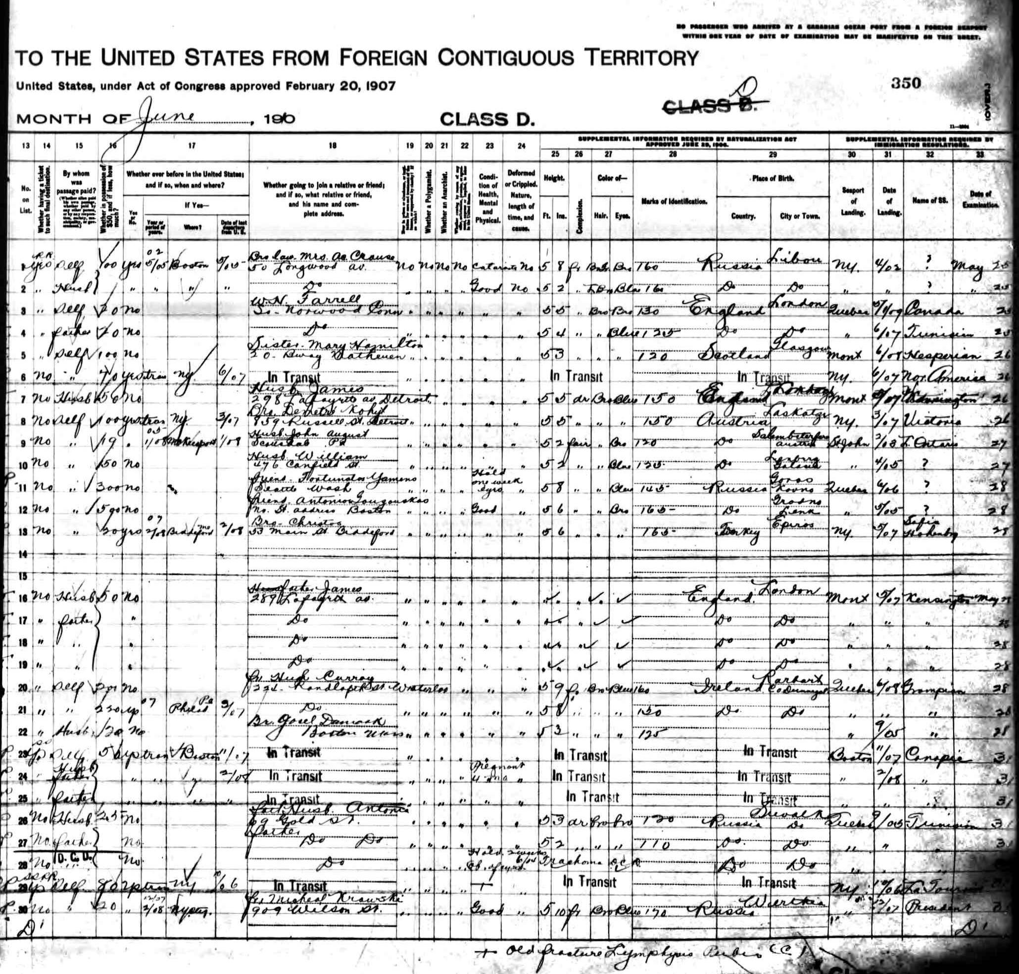 - Canada to U.S.border crossing record for June 1910
