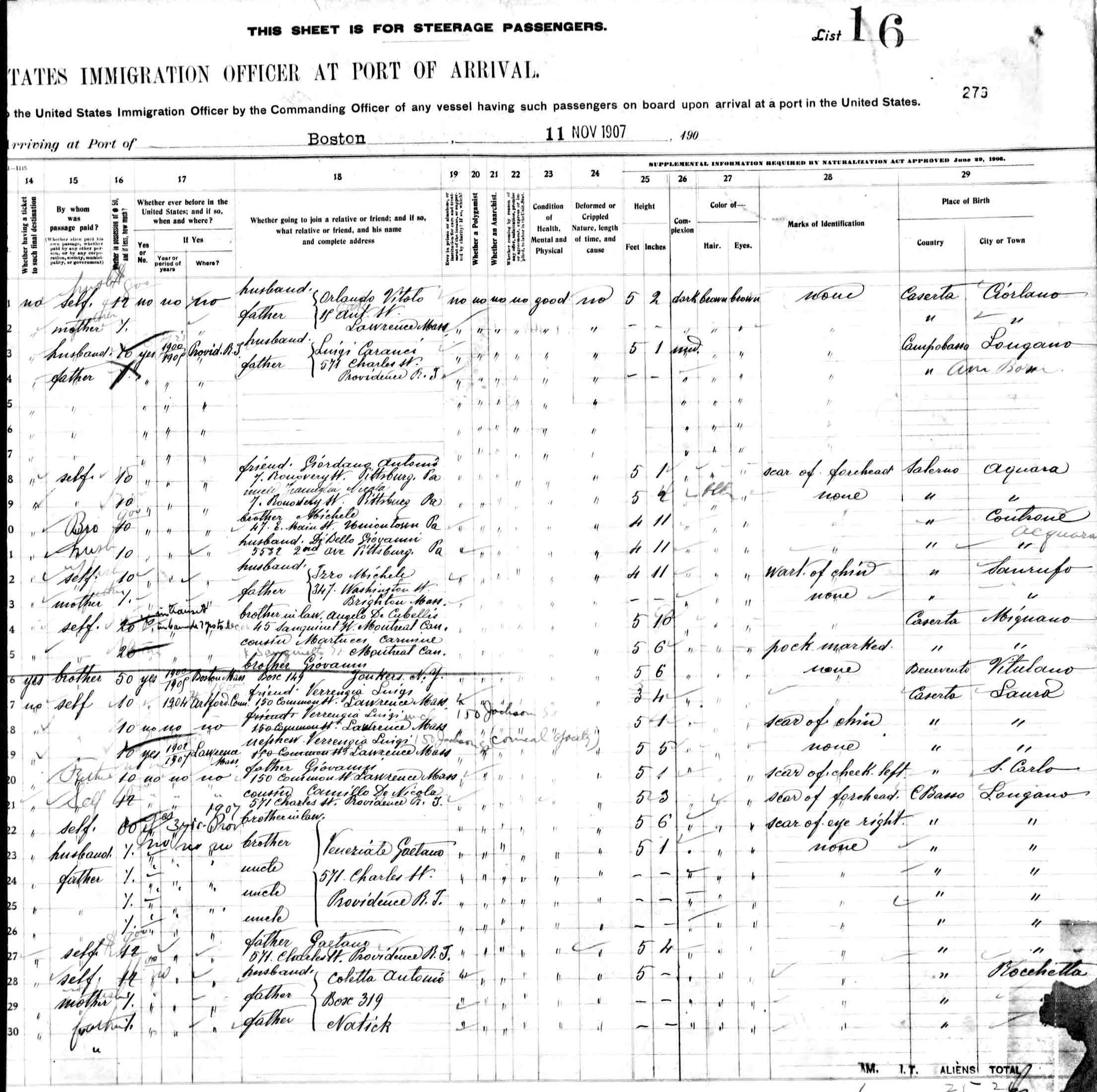 departed from Naples 30 October 1907 and arrived Boston 11 November 1907,