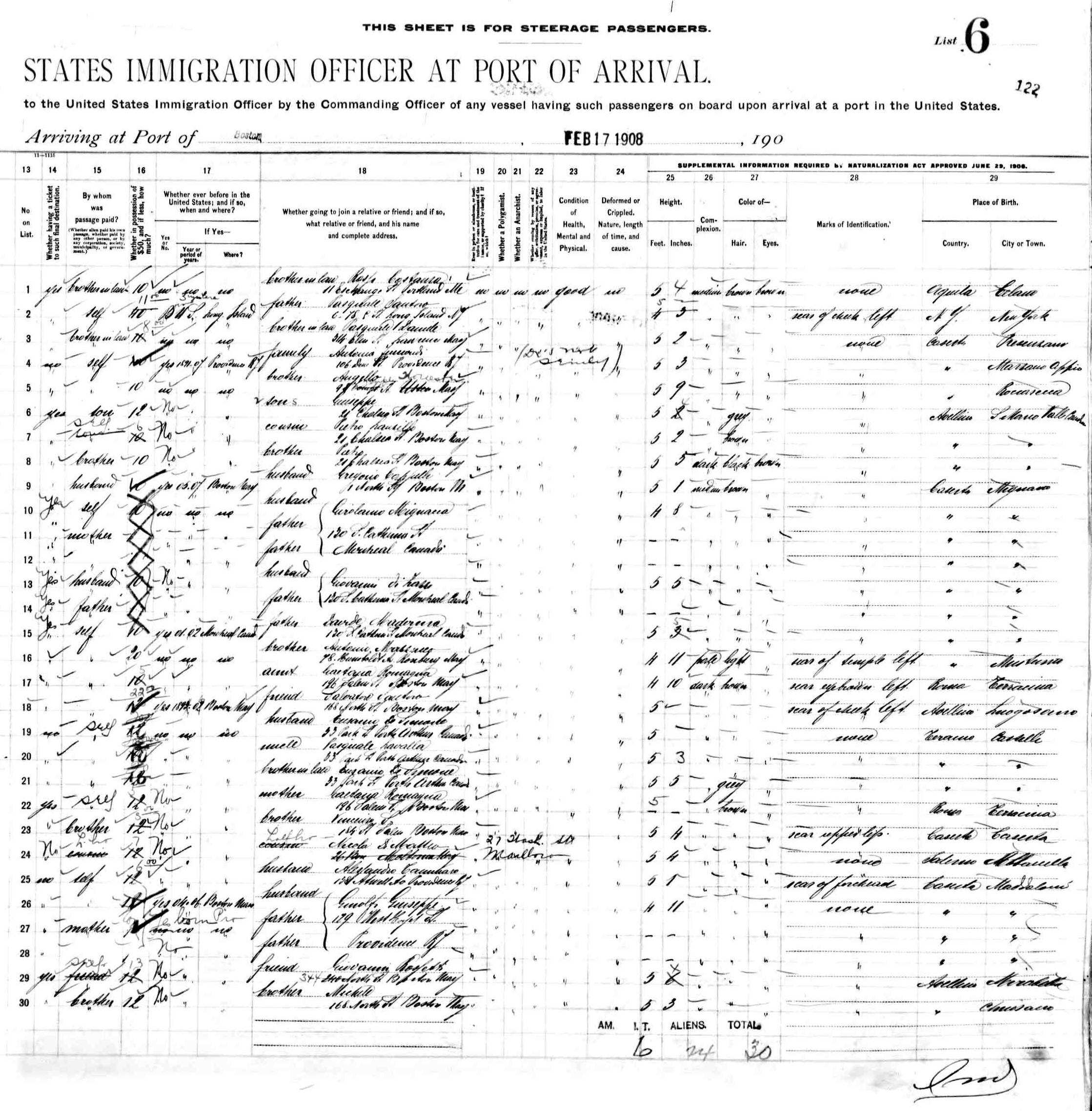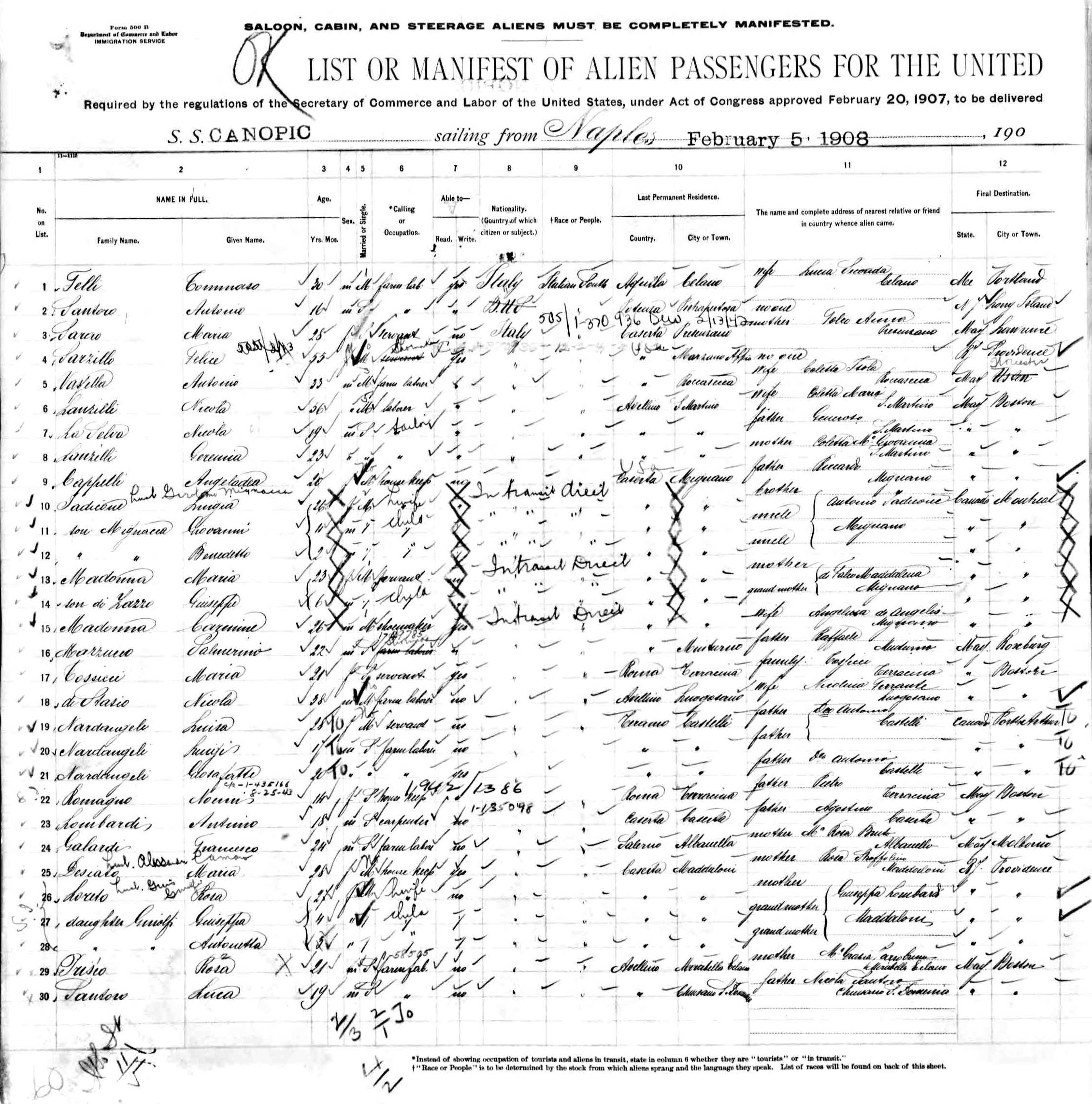 departed from Naples 5 February 1908 and arrived Boston 17 February 1908,