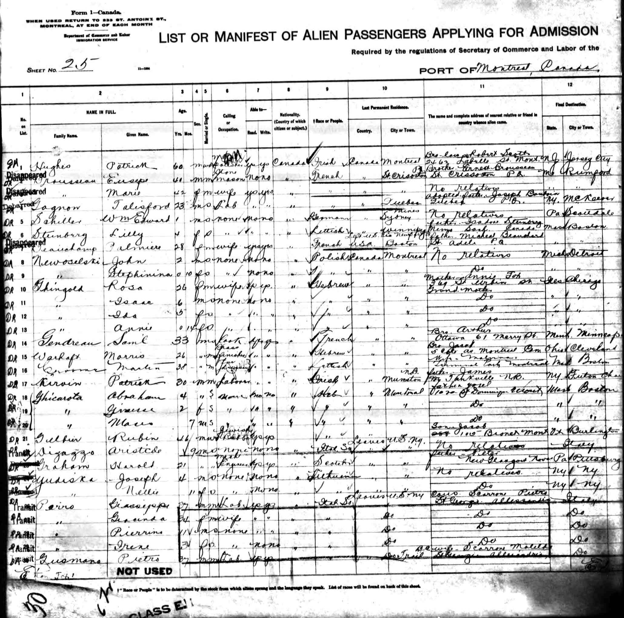 that she was traveling to Montreal, Cananda, that she had previously been in Montreal in 1907 through (or and) 1909,